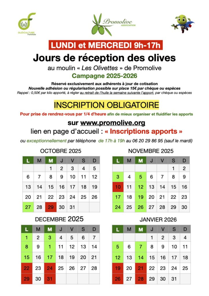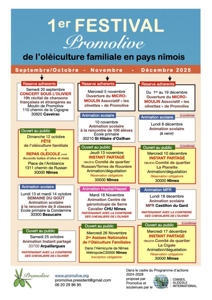 Promolive organise son premier festival de l’Oléiculture Familiale en pays nîmois, de septembre à décembre 2025, comportant la nouvelle « fête de l’olivier » et les « deuxièmes assises nationales de l’Oléiculture Familiale », mais aussi des interventions dans les établissements scolaires. Tout le programme à voir sur cette page. Inscrivez, dans notre partie « Animations » >