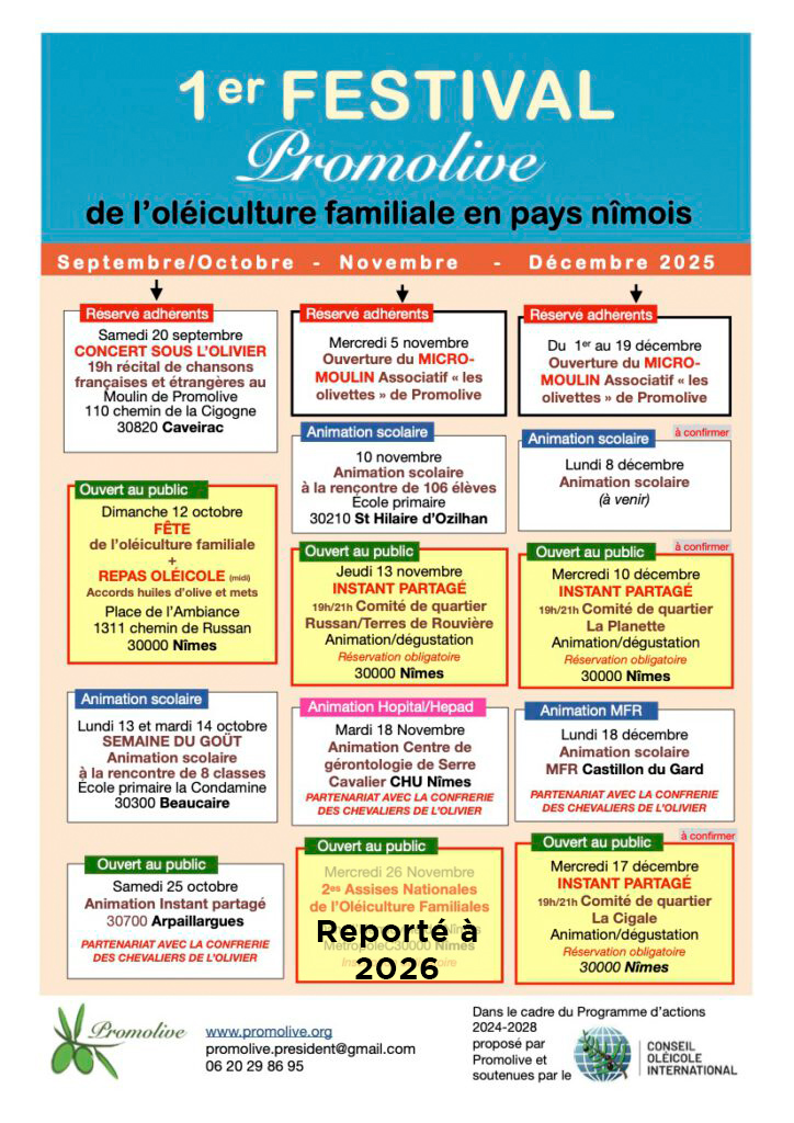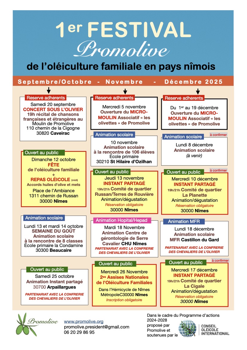 Tout le programme du premier festival Promolive de l’Oléiculture Familiale en pays nîmois. Animations scolaires, Instant Partagé, Fête de l’Oléiculture Familiale, ouverture du moulin, semaine du goût,… Réservation de votre place au repas de la nouvelle Fête de l’Olivier sur cette page.