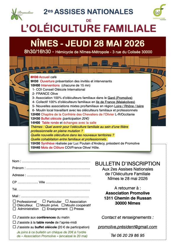 - Le Jeudi 28 mai 2026 [08h30-16h30] auront lieu les 2es Assises Nationalesde l'Oléiculture Familiale dans l'hémicycle de Nîmes Métropole au 3 Rue du Colisée, 30900 Nîmes.