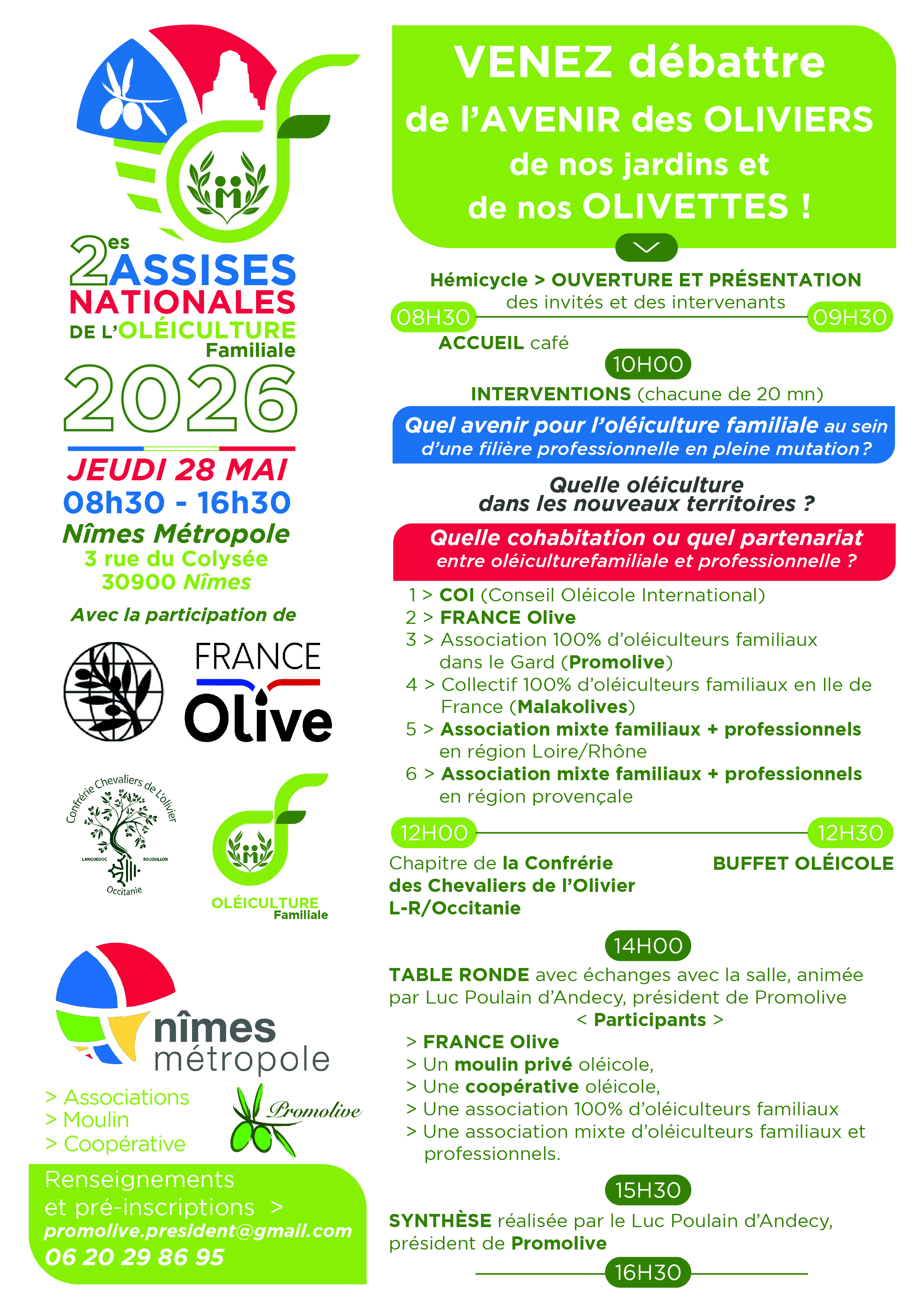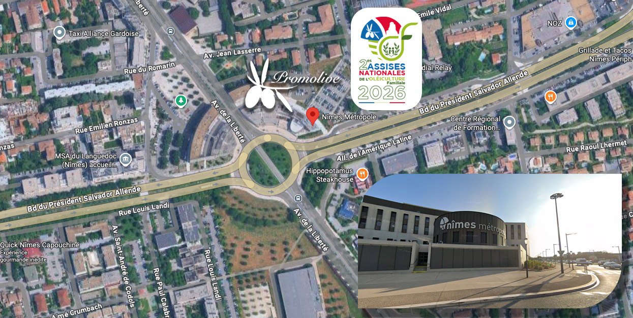 - Le Jeudi 28 mai 2026 [08h30-16h30] auront lieu les 2es Assises Nationalesde l'Oléiculture Familiale dans l'hémicycle de Nîmes Métropole au 3 Rue du Colisée, 30900 Nîmes.