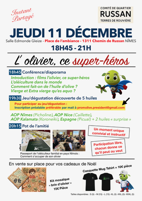 La date de « l’Instant partagé » au comité de Russan avait été repoussée. C’est le 11 décembre que vous pouvez enfin participer à ce début de soirée organisé par Promolive en partenariat avec le comité de quartier de Terre de Rouvière > Place de l’Ambiance au 1311 Chemin de Russan à Nîmes.