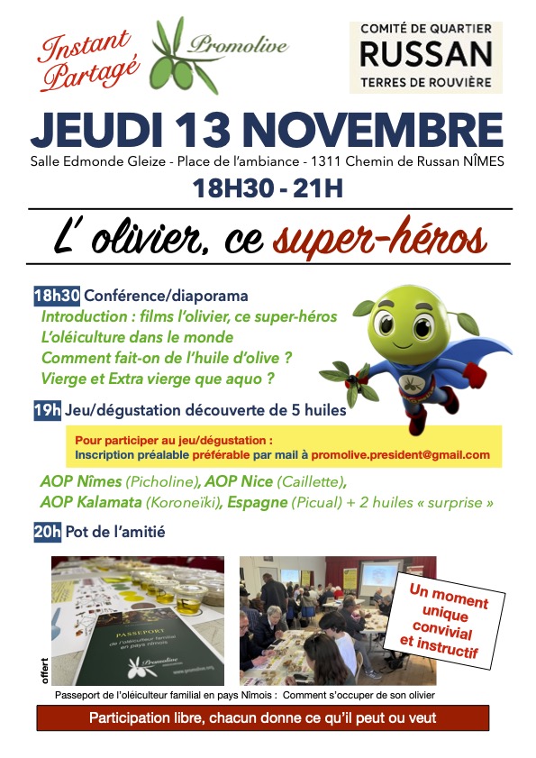 Promolive propose un « Instant partagé », le jeudi 13 novembre 2025 au comité de quartier de Russan (place de l’Ambiance, 1311 Chemin de Russan, Nîmes) avec conférence, dégustation et pot de l’amitié.
