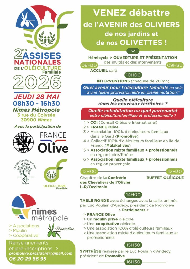 Un peu partout sur le site, page d’accueil et dans la partie Animations, vous avez toutes les informations pour vous inscrire et vous informer sur les 2es Assises Nationales de l’Oléiculture Nationale, qui auront lieu le Jeudi 28 Mai 2026 à de 8h30 à 16h30.