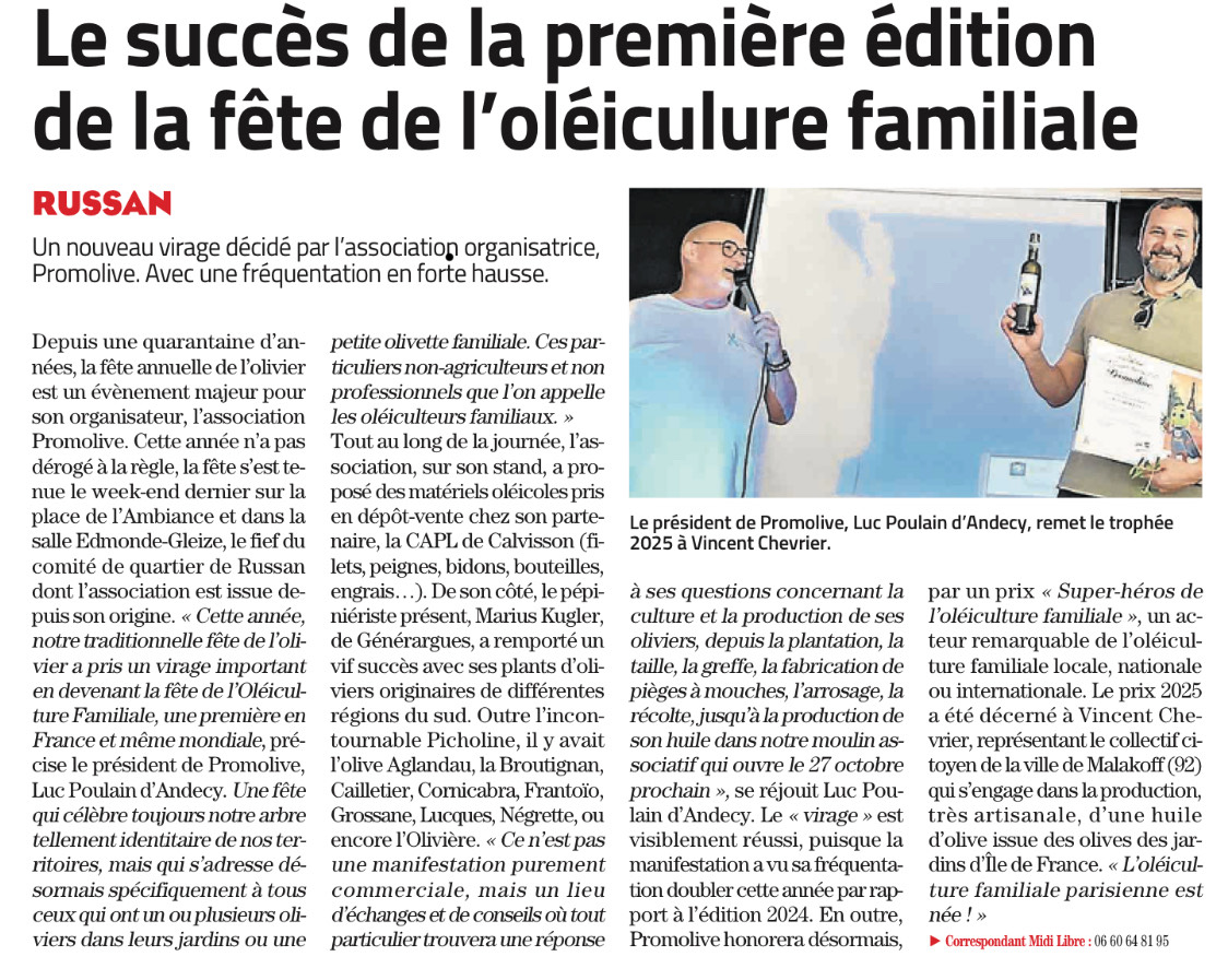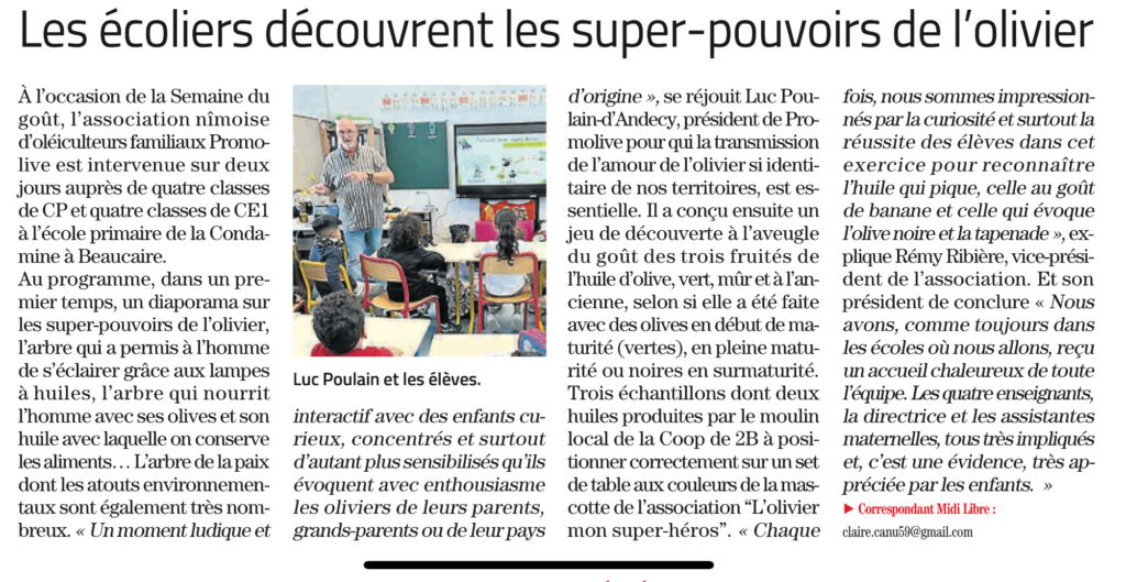 Deux articles à lire sur le Midi Libre papier. Promolive et l’olivier, mon super-héros à l’école (en ligne-payant) et un retour sur la Fête de l’Oléiculture familiale en pays nîmois (en ligne).