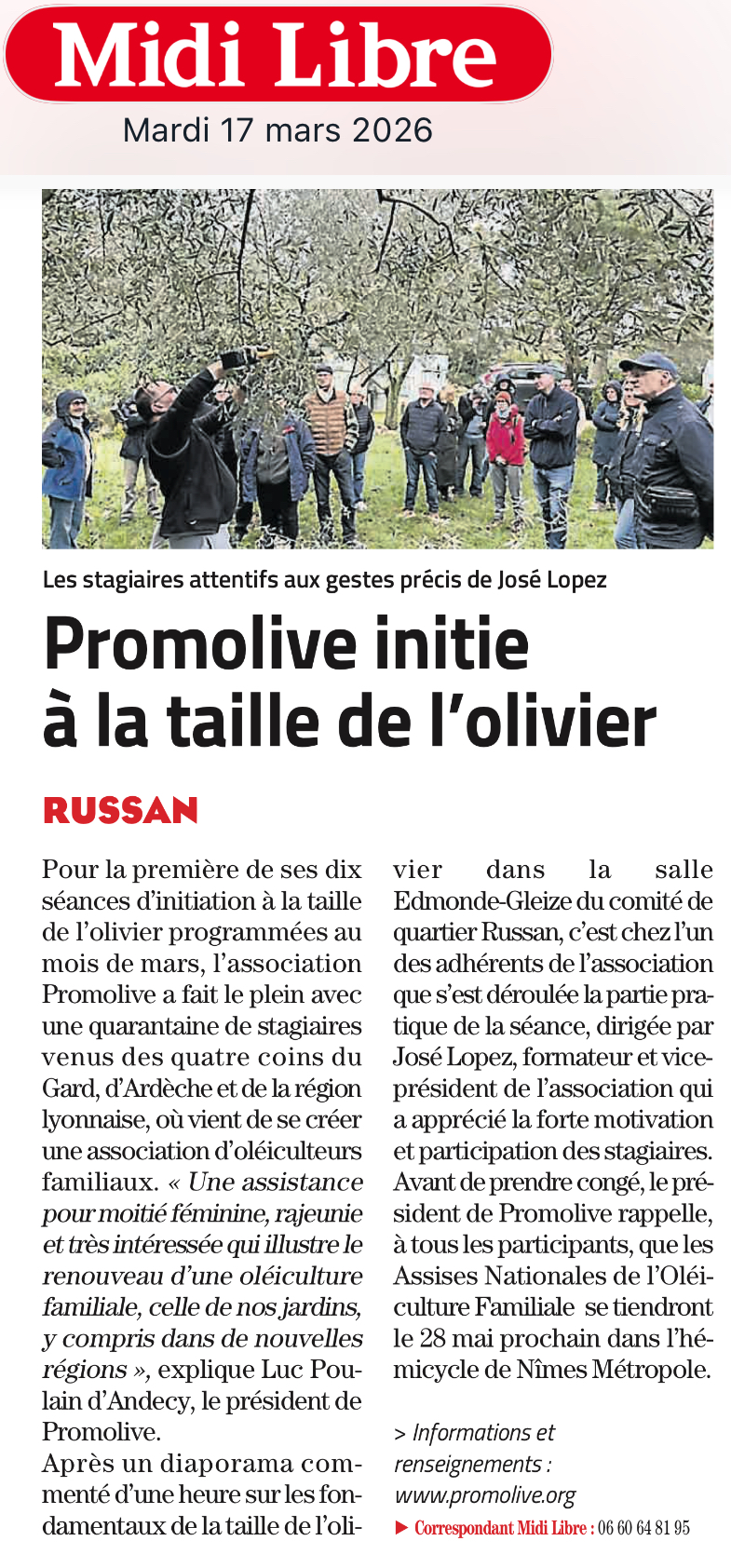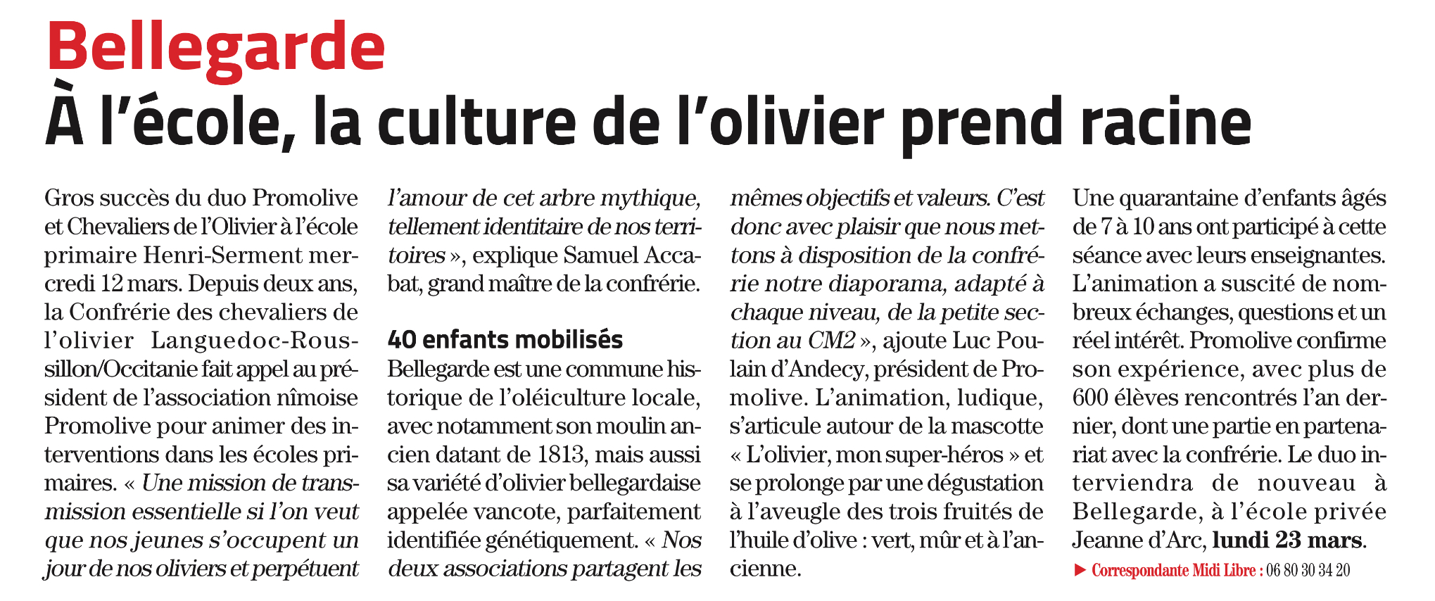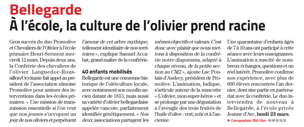 Articles du MidiLibre sur les démonstrations de taille et les interventions en milieu scolaire (Bellegarde mais aussi Villetelle) avec la Confrérie des Chevaliers de l’Olivier L/R.